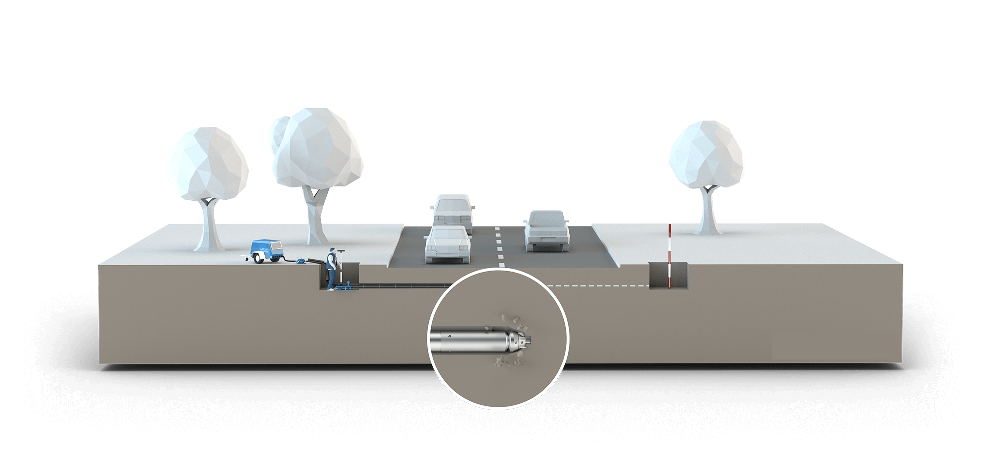 Durante el avance del GRUNDOMAT, el suelo se desplaza hacia el terreno circundante y se compacta. De este modo se crea un canal rectilíneo en el que se introducen al mismo tiempo o a posteriori tuberías cortas de PVC o tuberías largas de PE de hasta 160 mm de diámetro exterior, o cables, en longitudes de hasta 25 m.