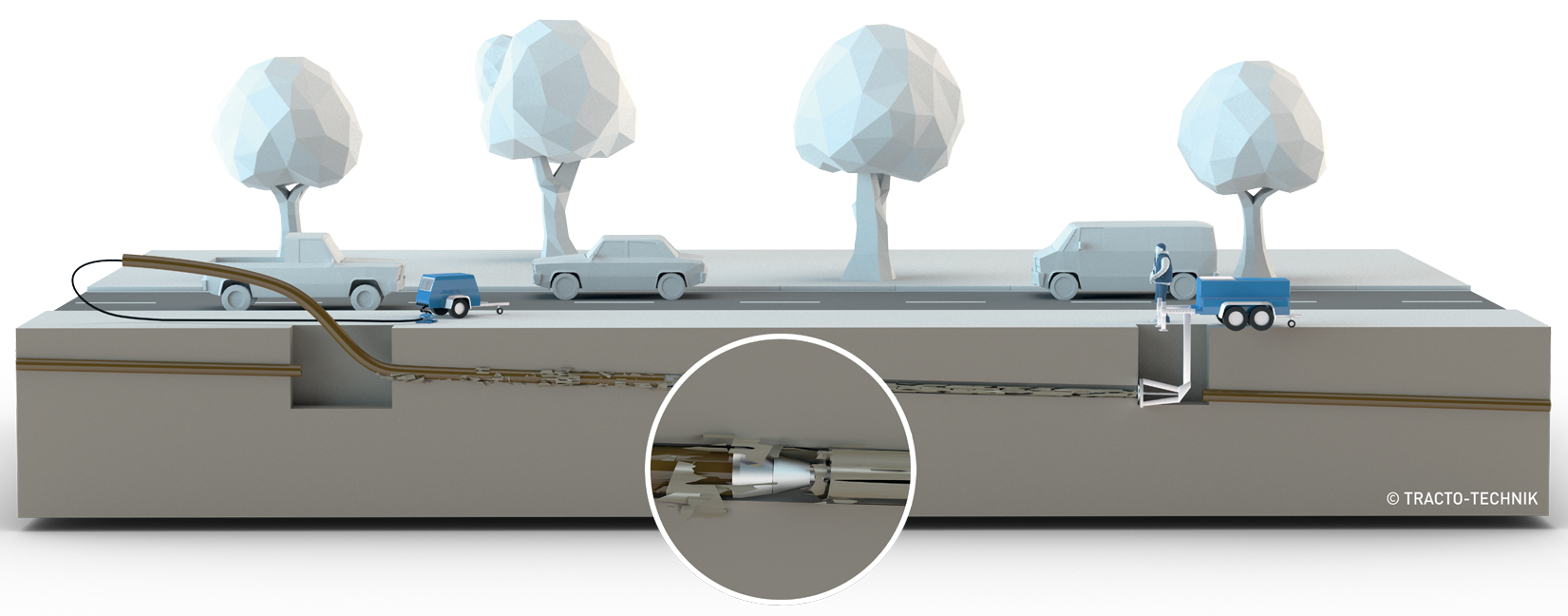 El Grundocrack se introduce por dentro de la tubería a sustituir de gres, cemento, sintética o de fundición gris y con su fuerza la revienta y la compacta. Al mismo tiempo se introduce la nueva tubería de igual o mayor diámetro. El Grundocrack puede trabajar desde arquetas de tan sólo 1 metro de diámetro. Sólo bifurcaciones y grandes curvas hacen necesarios pozos intermedios. Las tuberías de PVC o PE son las más sencillas de instalar.